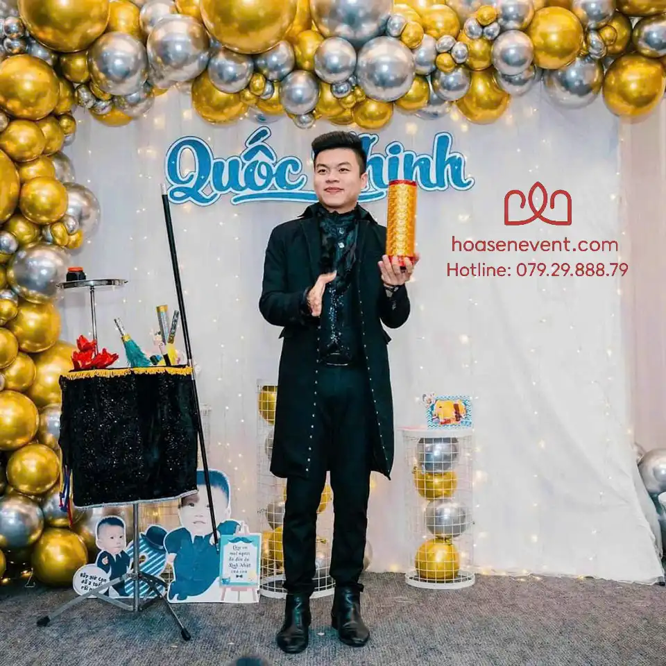 Thay vì dựng sân khấu cồng kềnh, chúng tôi sử dụng backdrop căng khung chữ X gọn gàng. Tập trung mạnh vào khâu thuê chú hề hoạt náo Gò Vấp. Chú hề xuất hiện chớp nhoáng, tổ chức các trò chơi tại chỗ (không cần di chuyển nhiều) và phát bong bóng liên tục.